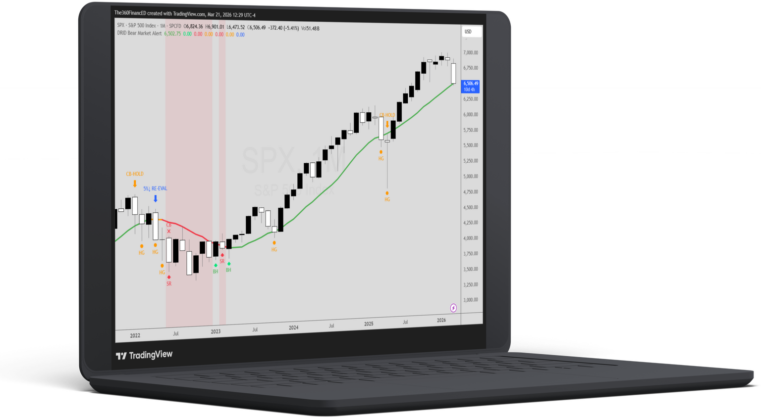DRID Bear Market Alert is the official TradingView indicator for the four-rule system in this book. It plots every buy, sell, hold, and circuit breaker signal automatically on the SPX monthly chart, so there's nothing to calculate and nothing to guess.Read the book first. The indicator makes the rules visible. The book explains why they work and what to do when they're tested. Together they give you both the system and the tool to run it.